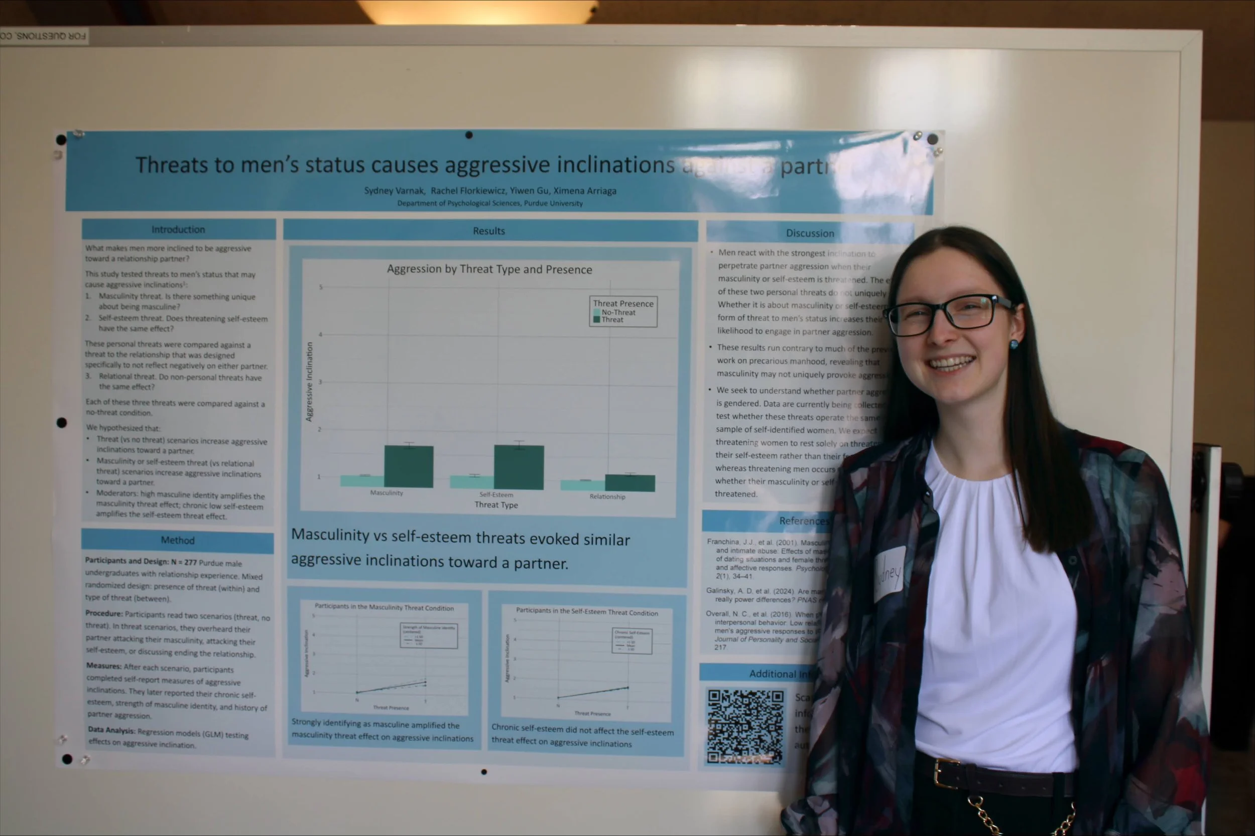 ARCC lab member Sydney Varnak presented a poster at the Purdue Psychological Sciences Undergraduate Research Conference titled “Threats to men’s status causes aggressive inclinations against a partner”. This poster won a Psi Chi Award from its submission at MPA!